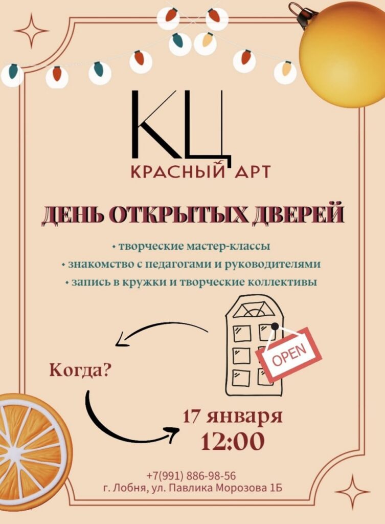17 января в 12:00 в лобненском культурном центре «Красный АРТ» состоится день открытых дверей. Мероприятие пройдёт в формате творческого знакомства.
