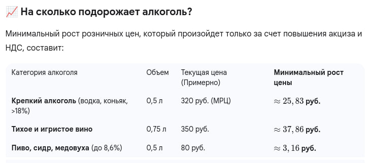 Также вырастет акциз для крепкого алкоголя (выше 18 градусов). С 2026 года он составит 824 рубля за литр спирта против действующих 740 рублей. Рост ставки – 11,4%.