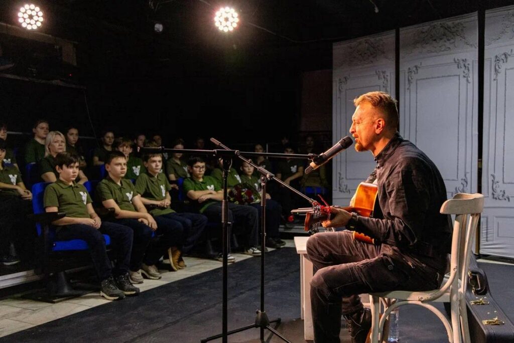 На встрече с Ильёй Оленевым опытные волонтёры Центра «Свечной блиндажик» и юные из десятой школы не только обсудили насущные вопросы, но и насладились проникновенными песнями и стихами собственного сочинения гостя.