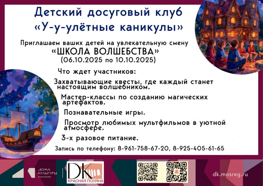 Детский досуговый клуб «У-у-улётные каникулы» в Доме культуры «Красная Поляна» приглашает школьников на смену «Школа волшебства» с 06.10.25 по 10.10.25!