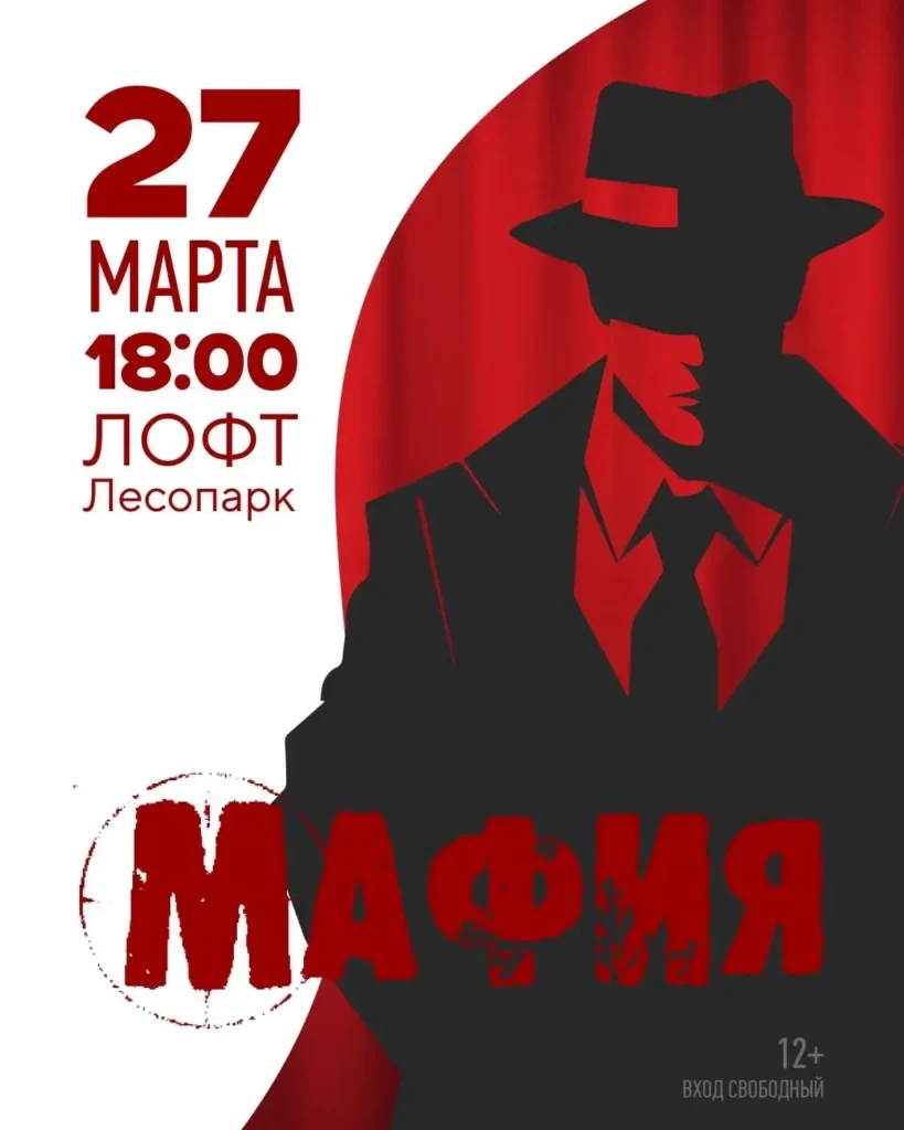 Приходи, чтобы примерить на себя маску мирного жителя, мафиози или комиссара — и проверить, насколько хорошо ты умеешь держать лицо 27 марта, пятница, 18:00 лофт «Шанса», Лобненский лесопарк Возраст: 12+ Вход свободный