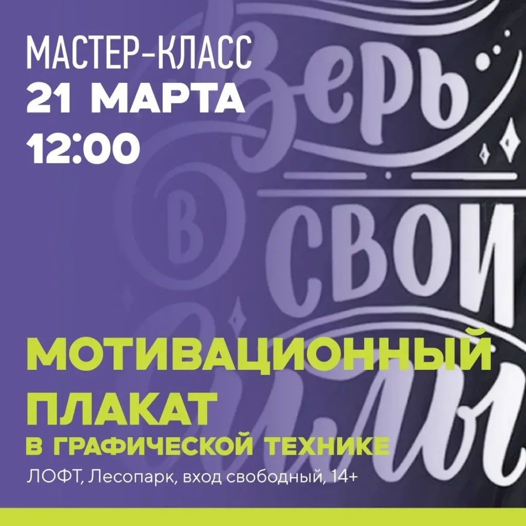 21 марта в 12:00 в лофте «Шанс» в Лобненском лесопарке состоится бесплатный мастер-класс по созданию мотивационного плаката в графической технике.