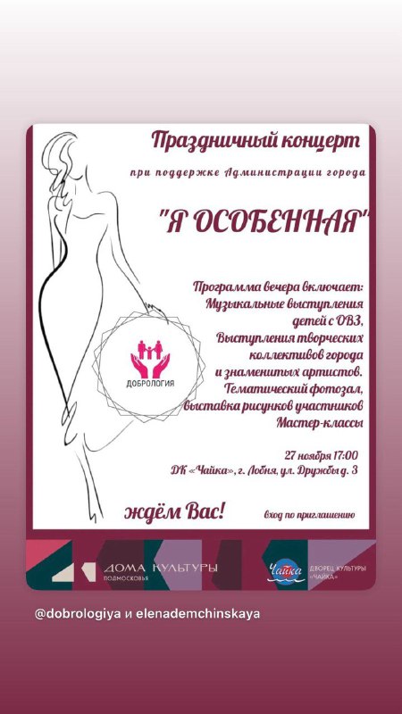 27 ноября в Доме культуры «Чайка» городского округа Лобня пройдет праздничный концерт «Я особенная», посвященный Дню матери и Дню инвалида. Его организует АНО «Добрология» при поддержке администрации муниципалитета.