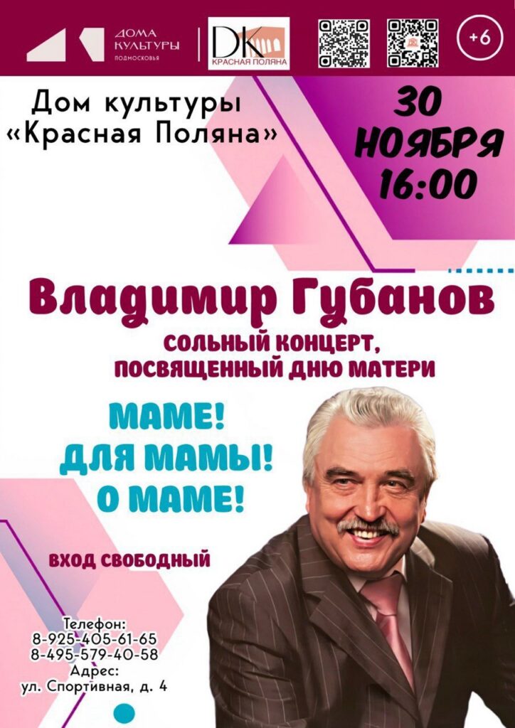 В этот же день в 16:00 в Доме культуры «Красная Поляна» (ул. Спортивная, 4) состоится сольный концерт почетного гражданина Лобни Владимира Губанова.