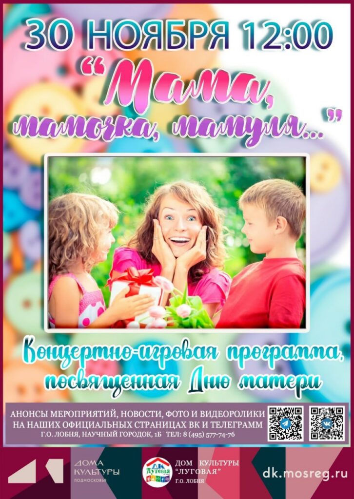 30 ноября в 12:00 в фойе Дома культуры «Луговая» начнется концертно-игровая программа «Мама, мамочка, мамуля». Гостей ждут творческие номера, интерактивные игры и душевная атмосфера.