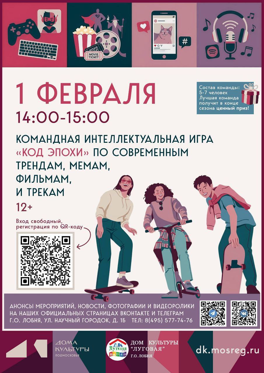 1 февраля в ДК «Луговая» городского округа Лобня состоится командная интеллектуальная игра «Код эпохи».