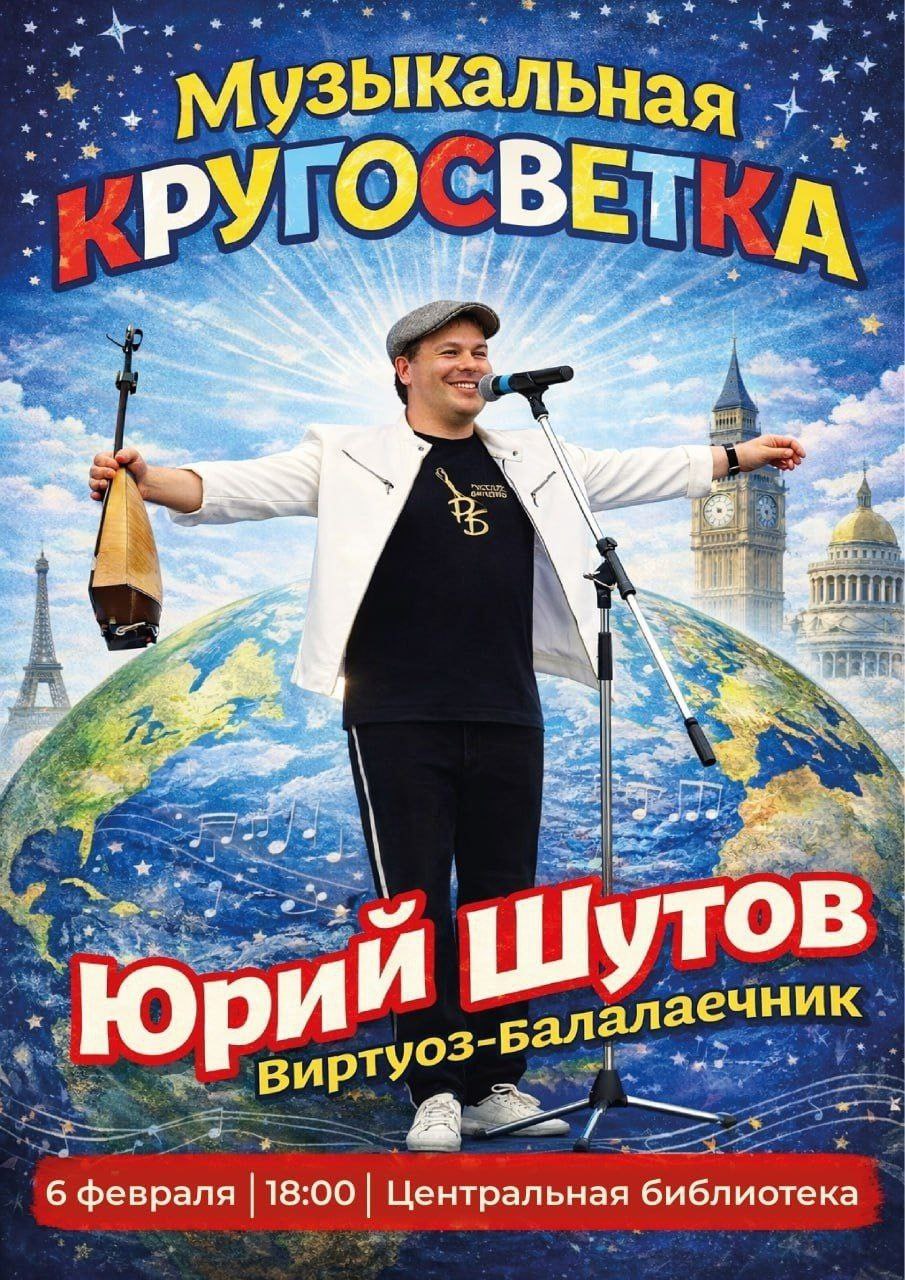 6 февраля в 18:00 в Центральной библиотеке Лобни (ул. Чехова, 5) состоится концерт «Музыкальная кругосветка». С программой выступит виртуозный музыкант, заслуженный балалаечник России Юрий Шутов.