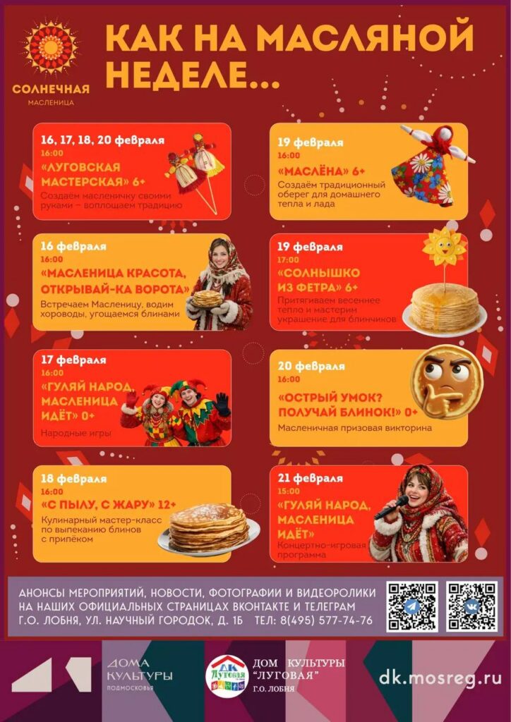 21 февраля 15:00 — «Гуляй народ, масленица идёт» — концертно-игровая программа. ПЛОЩАДЬ ПЕРЕД ДК.
