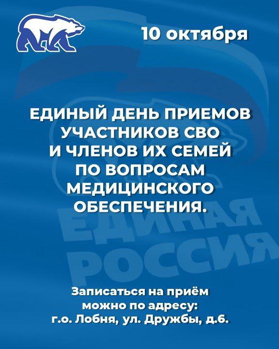10 октября 2025 г. «Единая Россия» проведёт единый день приёма участников СВО и их семей по вопросам медицинского обеспечения
