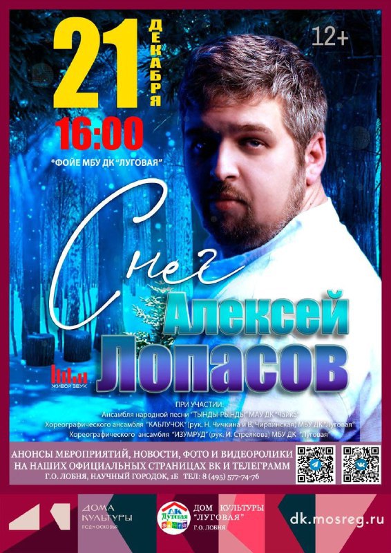 21 декабря в лобненском доме культуры «Луговая» состоится концерт «Снег». В программе выступление Алексея Лопасова при участии хореографических ансамблей «Изумруд» и «Каблучок», а также народного коллектива «Ансамбль народной песни «Тынды-Рынды». Зрителей ждут песни о зиме и Новом годе, а также прочтение авторских стихов.
