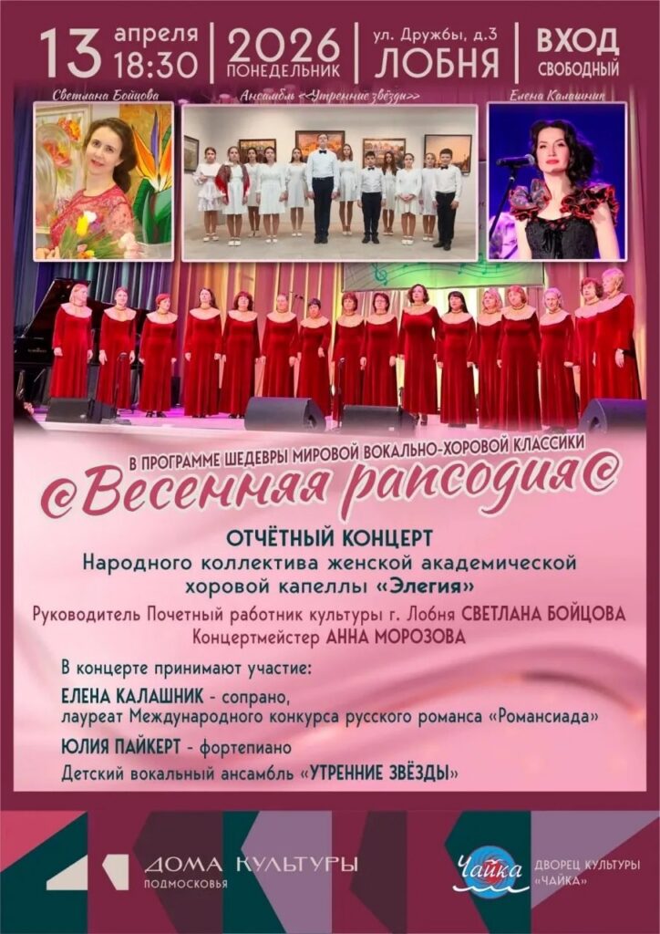 13 апреля жителей Лобни приглашают во Дворец культуры «Чайка» на отчётный концерт Народной женской академической хоровой капеллы «Элегия».
