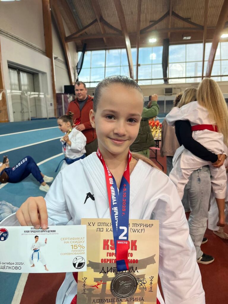 Серебро завоевала Арина Лобушева в категории ката среди девушек 8-9 лет.