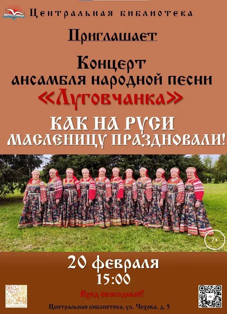 20 февраля (пятница) в 15:00 приглашаем вас в Центральную библиотеку (Чехова, 5) на праздничный концерт ансамбля народной песни «Луговчанка».