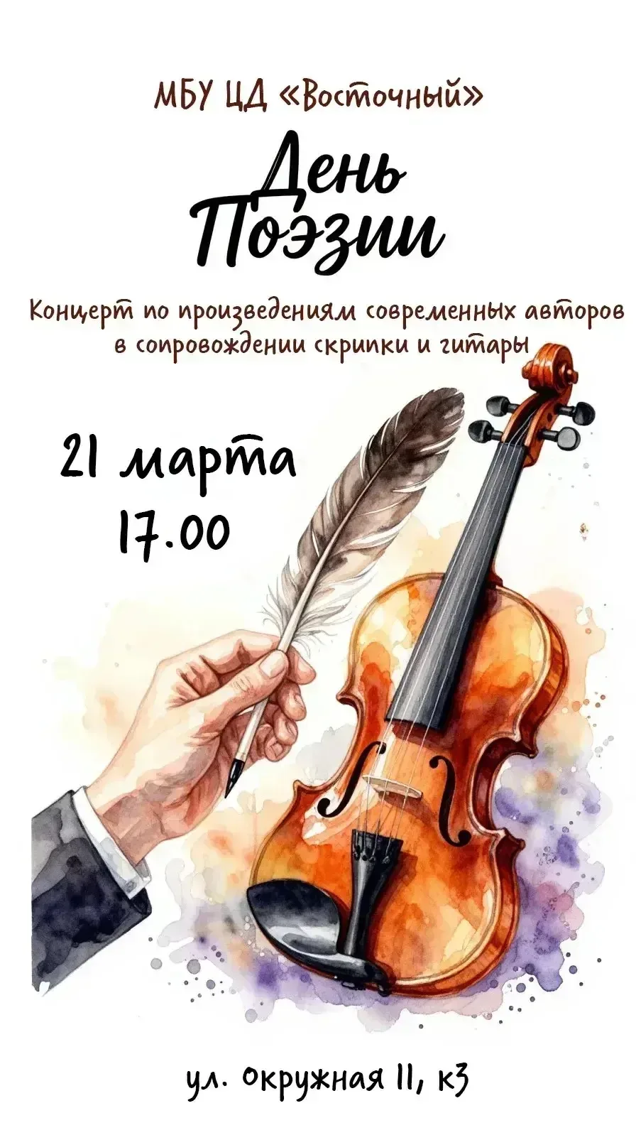 ЦД «Восточный» работвает в Лобне по адресу:, ул. Окружная, 11, корпус 3. Концерт пройдет здесь в субботу, 21 марта. Начало — в 17:00. Вход свободный. 14+ Напомним, Всемирный день поэзии был учреждён ЮНЕСКО в 1999 году. Он отмечается 21 марта — в день весеннего равноденствия, символизирующий обновление и пробуждение творческих сил. Главная цель праздника — поддержка языкового разнообразия, сохранение культурного наследия и популяризация поэзии как жанра. В этот день по всему миру проходят литературные чтения, поэтические вечера и встречи с авторами.