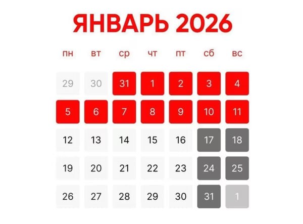 Новогодние каникулы-2026 станут самыми длинными за последние 12 лет. Они продлятся 12 дней — с 31 декабря по 11 января. Выходить на работу россиянам предстоит только в понедельник, 12 января.