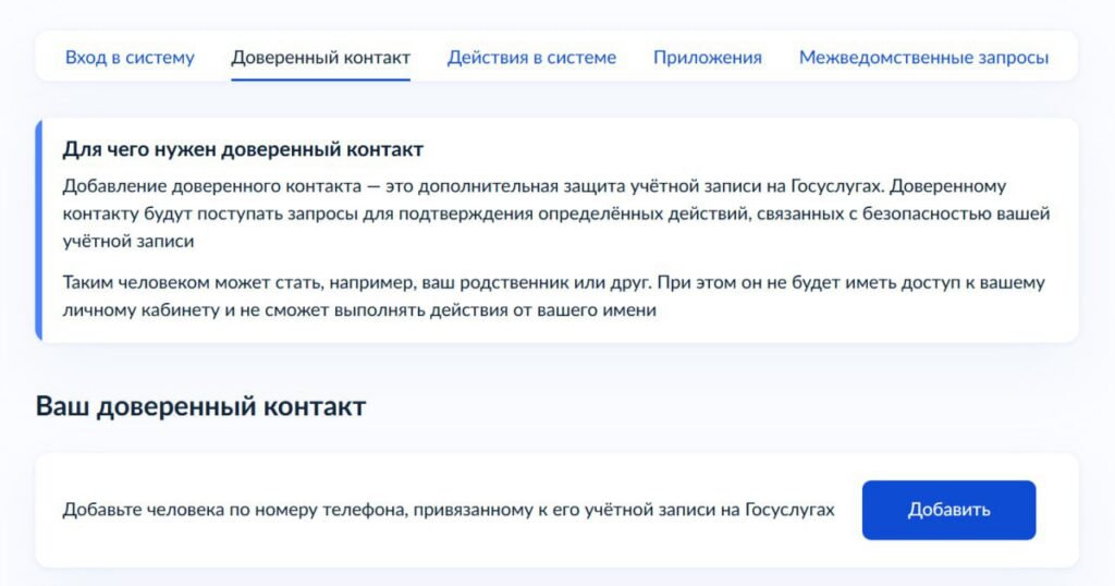 Доверенным контактом может стать родственник или близкий друг. При этом у него не будет доступа к вашему личному кабинету, и он не сможет выполнять действия от вашего имени.