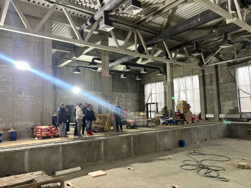 Внутри здания специалисты красят стены, укладывают плитку, монтируют потолочные системы и устанавливают освещение. В вентиляционных камерах идет монтаж оборудования.