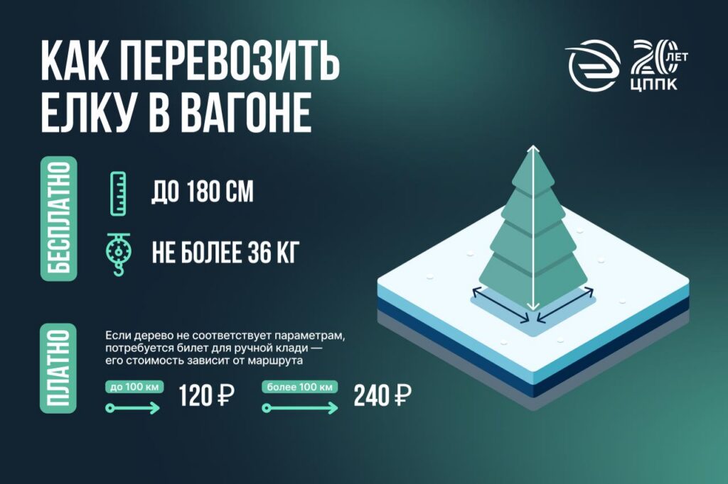 В Московской области пассажиры электричек могут бесплатно перевозить новогодние ёлки весом до 36 килограммов, сумма длины, ширины и высоты которых не превышает 180 см.
