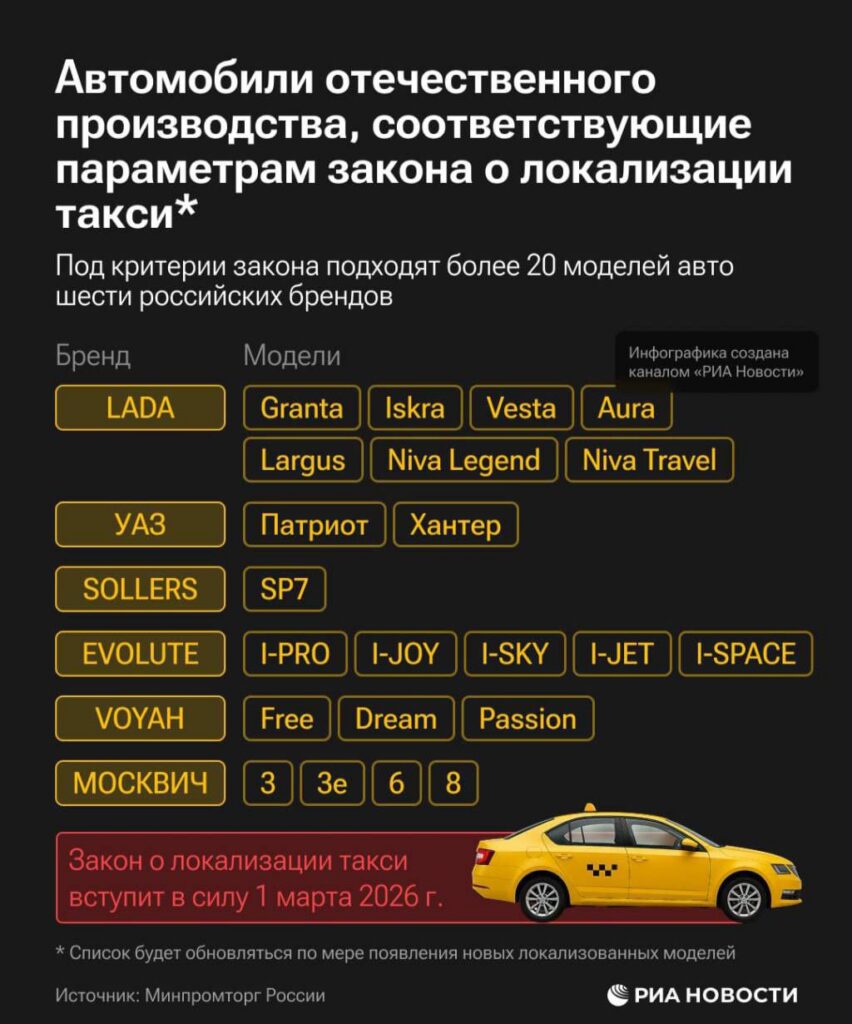 С 1 марта 2026 года в России начнет действовать закон о локализации такси. Согласно новым правилам, для работы в сервисах такси можно будет использовать только автомобили с высокой долей российских компонентов или произведенные по специальным инвестиционным контрактам. Цель этих мер – поддержка отечественного автопрома.