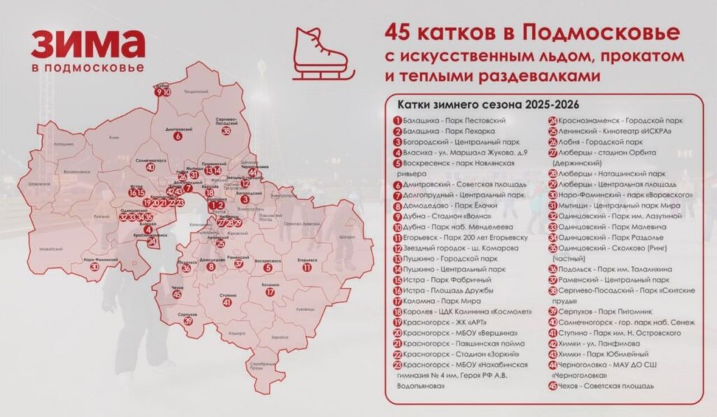 Сегодня более чем в 85 парках Подмосковья состоится открытие зимнего сезона. Начнут работать 45 катков с искусственным льдом, загорится праздничная иллюминация, откроются Резиденции и Почтовые ящики Деда Мороза. Также посетителей ждут ледяные квесты, световые представления, мастер-классы, концерты и другие развлечения.