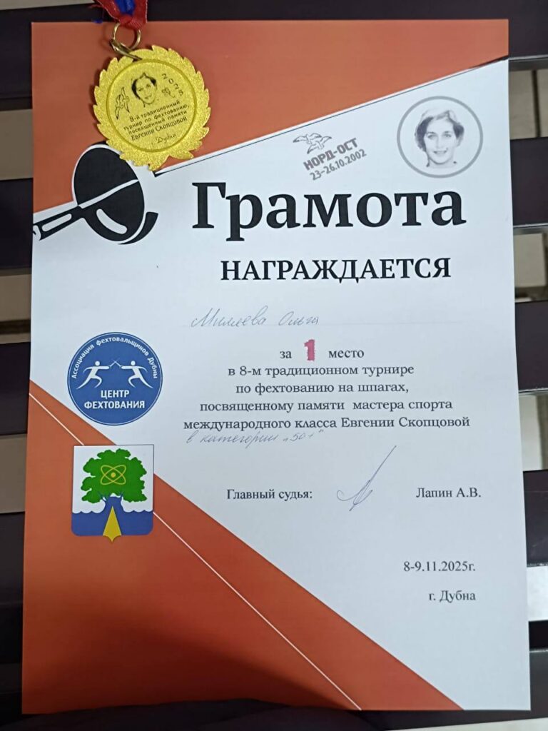 В подмосковной Дубне 8-9 ноября 2025 года прошел VIII турнир по фехтованию на шпагах, посвященный памяти мастера спорта международного класса Евгении Скопцовой. Соревнования собрали лучших спортсменов, чтобы выявить сильнейших и почтить память выдающейся фехтовальщицы, трагически погибшей во время теракта на мюзикле «Норд-Ост» в 2002 году.