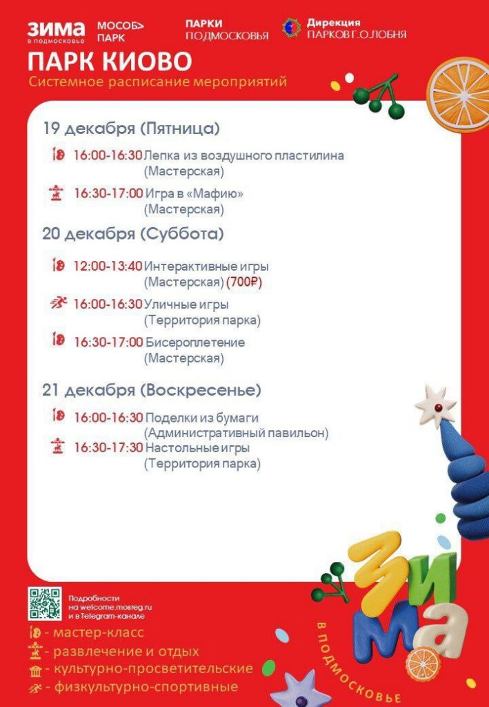 С 19 по 21 декабря в парке «Киово» проведут мастер-классы, уличные и настольные игры.