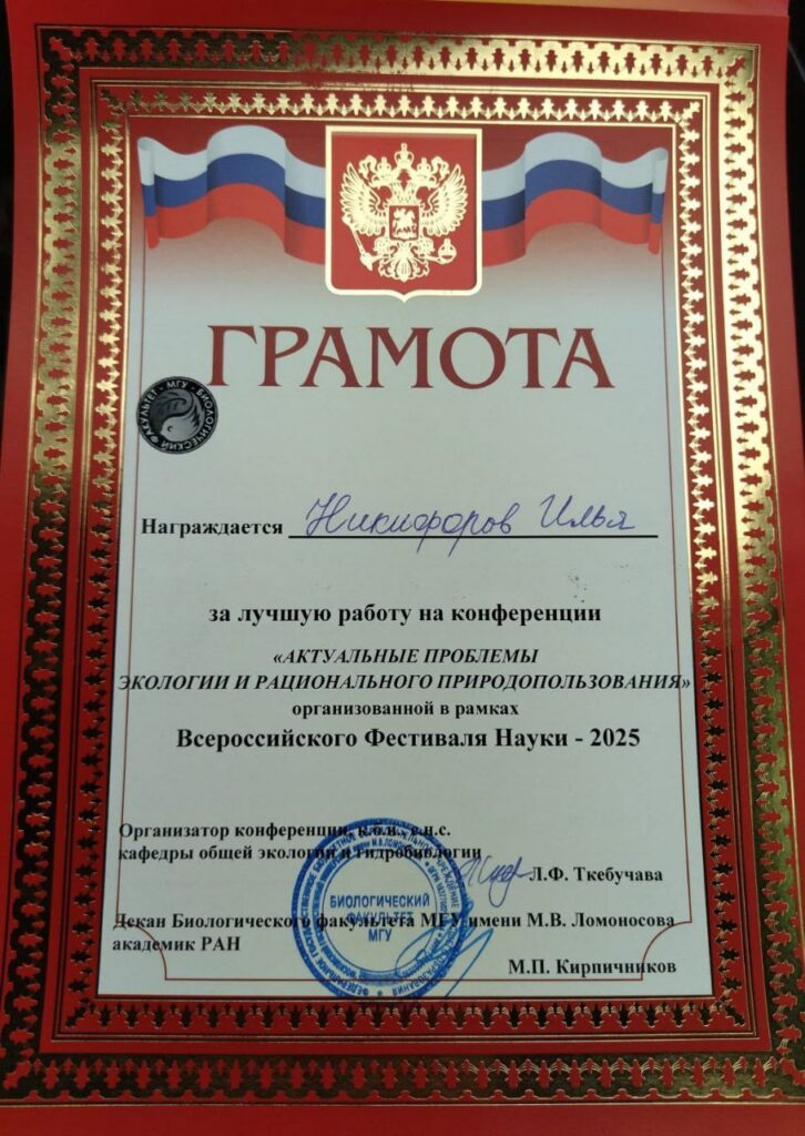 11 октября 2025 года в Московском государственном университете имени М. В. Ломоносова состоялась Всероссийская конференция «Актуальные проблемы экологии и рационального природопользования» в рамках Всероссийского фестиваля науки 2025. В ней принял участие ученик 7М класса лобненского лицея «Авиатика» Илья Никифоров.