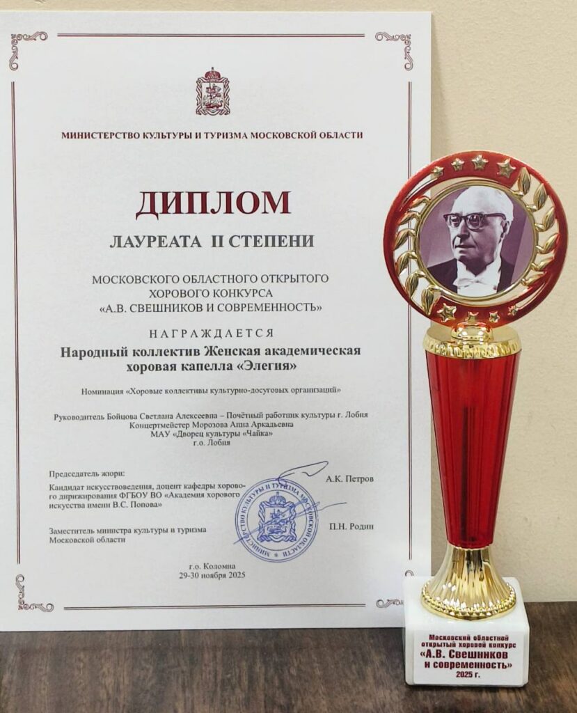 Народный коллектив женская академическая хоровая капелла «Элегия» из лобненского Дворца культуры «Чайка» завоевала диплом лауреата II степени на Московском областном открытом хоровом конкурсе «А.В. Свешников и современность».