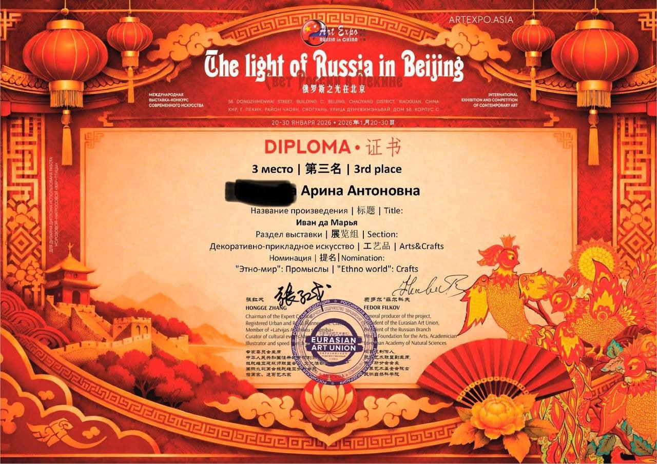 Учащаяся объединения «Ярмарка мастеров» лобненского Дворца детского и юношеского творчества «Планета талантов» Арина Н. стала призёром международной выставки-конкурса российского современного искусства «Свет России».