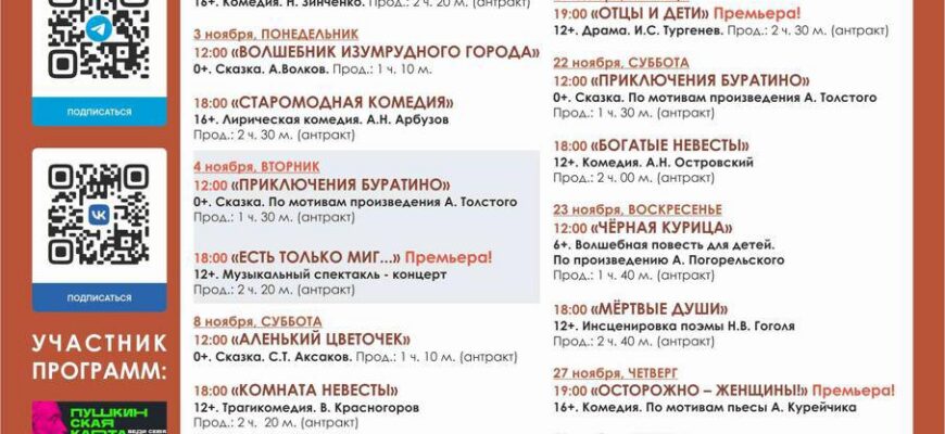 Ноябрь обещает быть весьма насыщенным! В этом месяце мы подготовили для вас множество спектаклей, чтобы сделать финал осени теплым и радостным. Особое внимание — праздничным дням:2, 3 и 4 ноября в «Камерной сцене» покажем любимые комедии: “