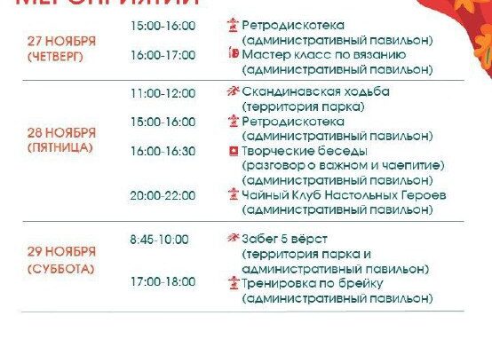 2 ноября, начало в 12:00 часов. Вас ждут: — Увлекательная концертная программа; — Интересные мастер-классы; — Красочные выставки и фотозоны; — Захватывающие показательные выступления школы Олимпийского тхэквондо «Центр-Восток»;