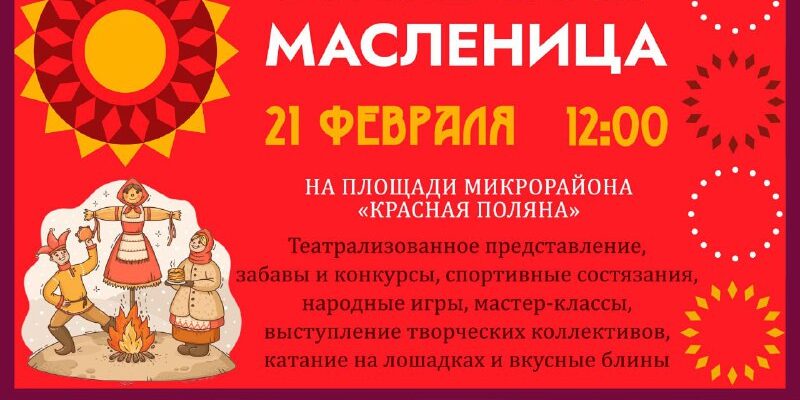 В последний день масленичной недели микрорайон Красная Поляна встретит весну широким народным гуляньем. 21 февраля в 12:00 на площади у ДК «Красная Поляна» развернётся праздничная программа «Солнечная Масленица». Организаторы подготовили театрализованное представление