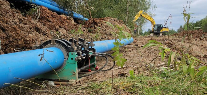 Вдоль улиц Киово и Павлика Морозова в микрорайоне Восточный города Лобня идет строительство канализационной сети. Проект разделен на шесть этапов, каждый из которых охватывает определенный участок вокруг озера Киово. Рабочие еженедельно прокладывают около