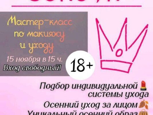 Приглашаем вместе с опытным специалистом взглянуть на себя по-новому и раскрыть сияние своей красоты. На бесплатном мастер-классе 15 ноября в 15.00 вы узнаете о нюансах осеннего ухода за кожей, продегустируете замечательные ароматы и создадите свой новый осенний макияж.