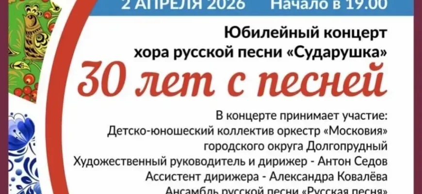 2 апреля в 19:00 во Дворце культуры «Чайка» состоится юбилейный концерт хора русской песни «Сударушка», посвящённый 30-летию со дня основания коллектива. В программе вечера прозвучат любимые песни разных лет, ставшие визитной карточкой коллектива, а также