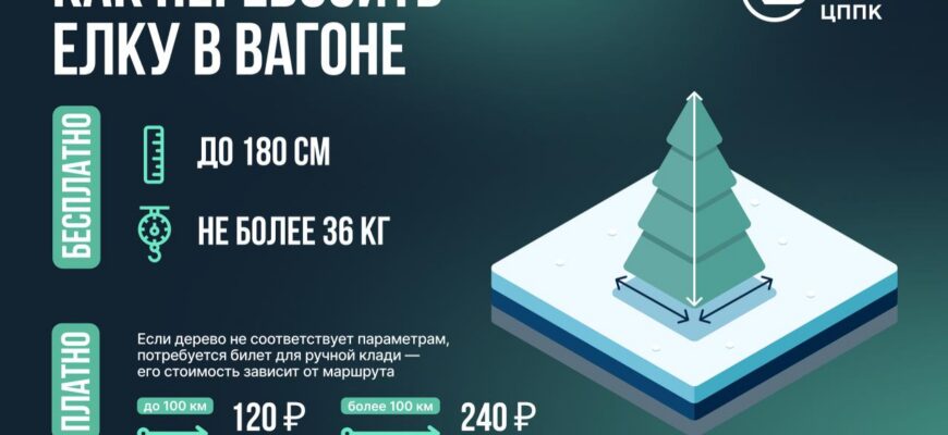 В Московской области пассажиры электричек могут бесплатно перевозить новогодние ёлки весом до 36 килограммов, сумма длины, ширины и высоты которых не превышает 180 см. Ёлка должна быть чистой, не повреждать обшивку сидений и не создавать неудобств другим пассажирам.