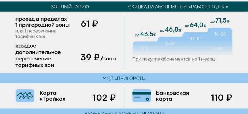Новый тариф составит 61 рубль (вместо нынешних 52 рублей) за одну пригородную зону и 39 рублей (вместо 36) за каждое дополнительное пересечение тарифных зон. Тариф в пределах зоны МЦД «Пригород» при оплате картой «