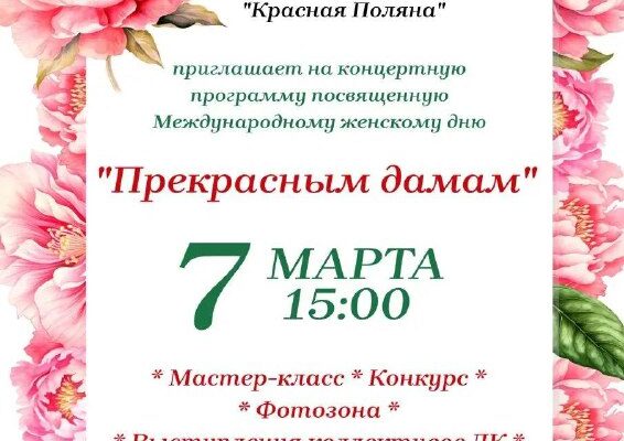 Дорогие женщины, в честь Международного женского дня мы готовим для вас особенный праздник — полный радости, творчества и весеннего настроения! Что вас ждёт: яркие выступления творческих коллективов ДК; увлекательный мастер‑класс — раскройте свои таланты;