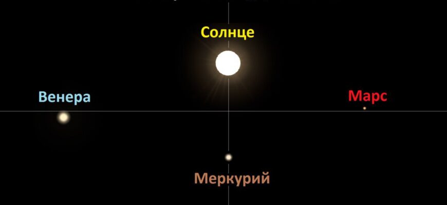 Сегодня в 18:48 по московскому времени ожидается кульминация парада планет, выстраивавшегося вокруг Солнца в течение последних нескольких месяцев. Меркурий соединится с Солнцем на небе по долготе на расстоянии около 2 градусов.