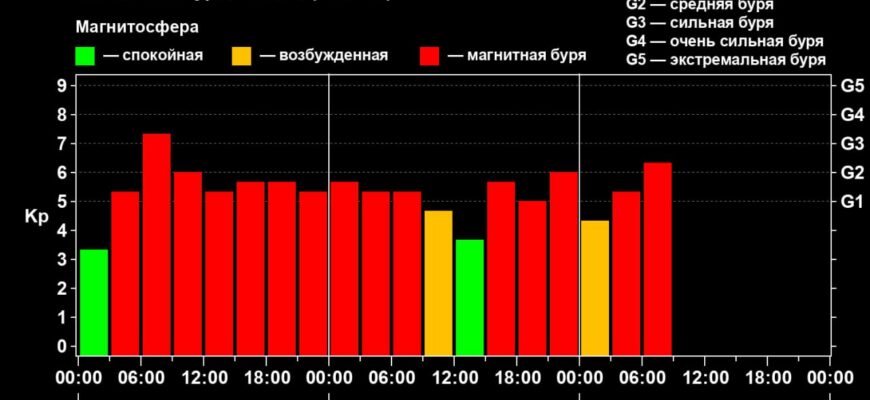 Уже третьи сутки продолжается магнитная буря, вызванная экстремально высокой скоростью солнечного ветра. Магнитный шторм, начавшийся еще во вторник утром, продолжается уже более 50 часов. Его уровень оценивается в диапазоне G1–G3, то есть от слабого до