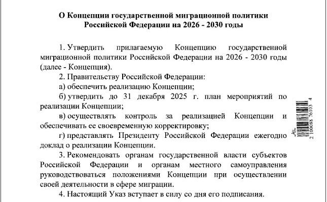 Президент России Владимир Путин утвердил Концепцию государственной миграционной политики на 2026–2030 годы. Некоторые положения концепции: – В России создадут условия для возвращения жителей новых регионов, уехавших во время СВО. –