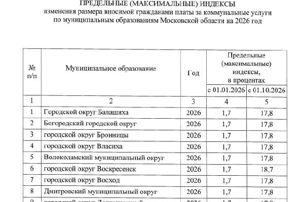 Губернатор Московской области Андрей Воробьёв подписал постановление, которое устанавливает максимальные индексы изменения размера платы за коммунальные услуги для всех муниципальных образований региона на 2026 год. Согласно документу, с 1 января по 30