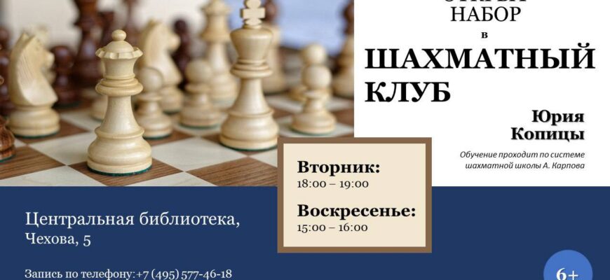 Центральная библиотека приглашает юных любителей интеллектуальных игр на занятия по шахматам под руководством опытного тренера Юрия Копицы. Расписание занятий: Каждый вторник:с 18:00 до 19:00Каждое воскресенье:с 15:00