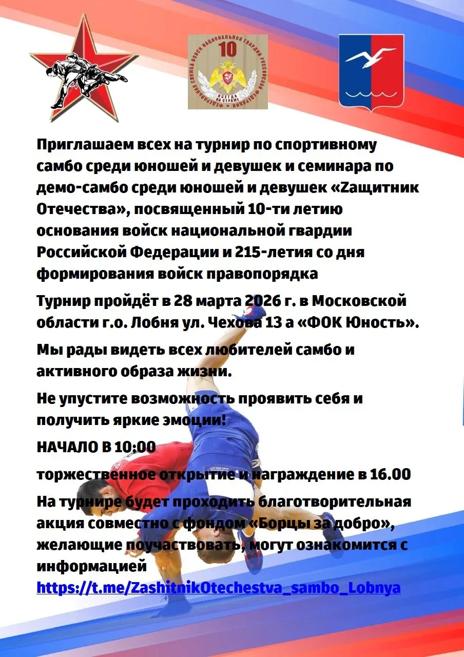 28 марта в 10.00 в лобненском физкультурно-оздоровительном комплексе «Юность» состоится масштабный турнир по самбо. Состязания посвящены двум важным датам: 10-летию основания войск национальной гвардии Российской Федерации и 215-летию со дня формирования войск правопорядка.
